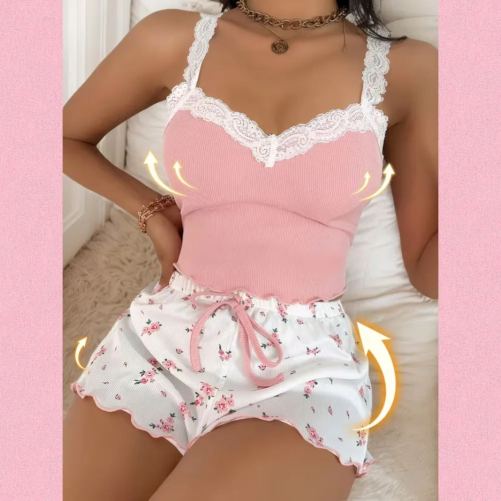 Кружевной набор с цветочным принтом создан для тех, кто ценит комфорт и женственность даже в домашней одежде. Майка с изящной кружевной отделкой подчёркивает зону декольте, а лёгкие шорты с цветочным узором обеспечивают свободу движений. Комплект отлично подойдёт для сна, отдыха дома или уютных вечеров.