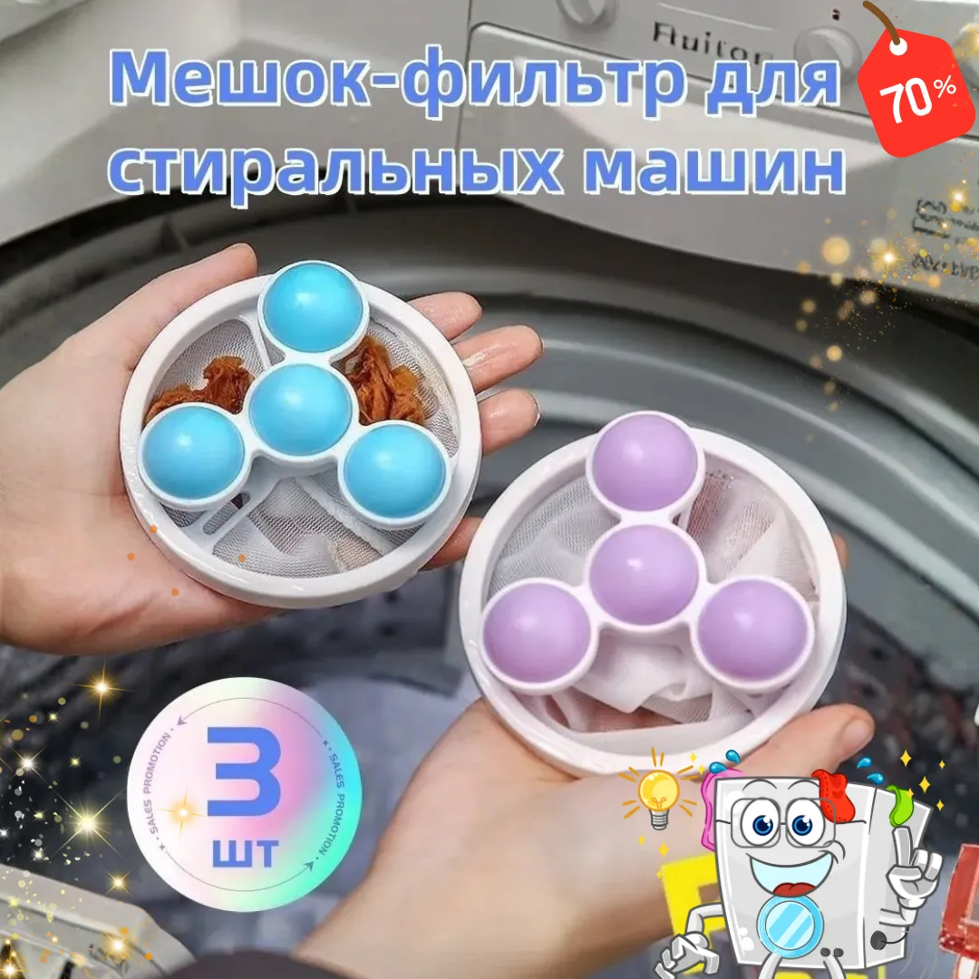 Плавающий фильтр с тонкой сеточкой эффективно собирает волосы, шерсть и мелкий мусор прямо во время стирки. Защищает одежду и слив от засоров, легко промывается и подходит для многоразового использования. В комплекте 3 фильтра — удобно и выгодно
