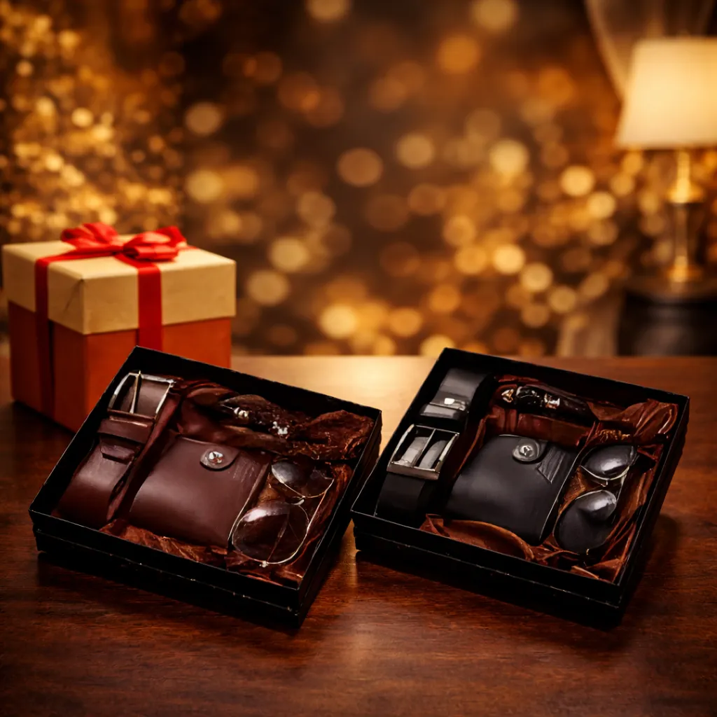 Этот мужской набор — идеальное сочетание стиля и функциональности. Внутри вы найдете все необходимые аксессуары для современного мужчины: ремень, портмоне, очки и браслет, которые гармонично дополняют любой образ. Подарочная упаковка делает этот набор отличным решением для подарка на любой праздник — день рождения,или просто без повода. Каждый элемент выполнен в современном дизайне и отлично сочетается между собой, создавая цельный и дорогой образ.