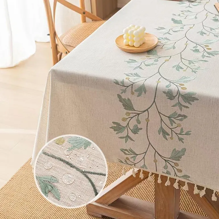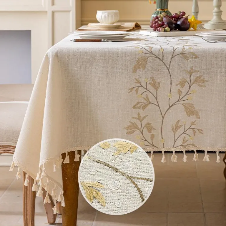 Наслаждайтесь уютом без хлопот! Эта скатерть из натурального хлопка и льна с деликатной вышивкой выглядит элегантно и дорого, но при этом обладает современными преимуществами: специальная пропитка делает её полностью водонепроницаемой — пролитый чай, сок, вино или суп просто скатываются каплями и легко вытираются салфеткой. Пыль и мелкие крошки почти не оседают на поверхности, стол всегда выглядит чистым.