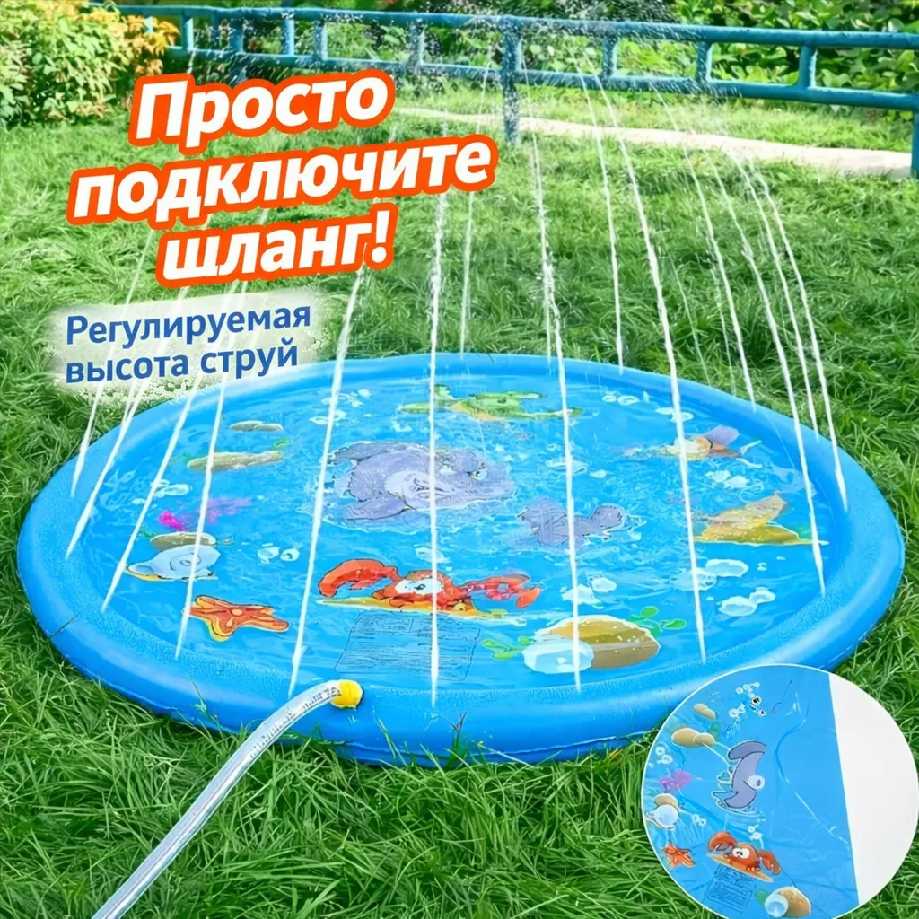 Надувной коврик-фонтан — идеальное развлечение для жарких летних дней! Диаметр 100 см, яркий дизайн с милыми морскими обитателями. Просто подключите к садовому шлангу — и фонтан начнёт брызгать весёлыми струйками! Ребёнок будет с удовольствием бегать, прыгать и ловить прохладные брызги. Создайте настоящую мини-аквапарк прямо на газоне или во дворе!