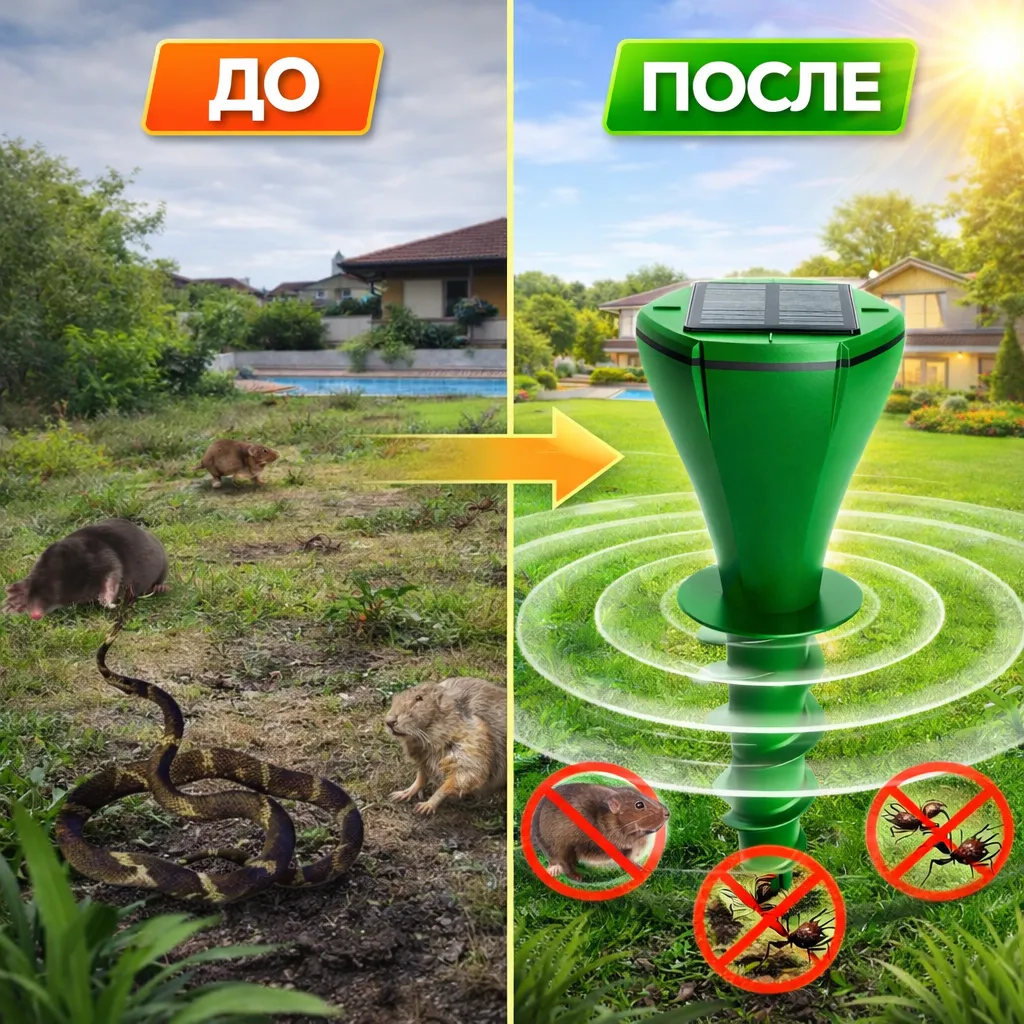Отпугиватель всех насекомых и диких животных — это современное устройство для защиты вашего участка от вредителей без использования химических средств. Прибор работает на солнечной батарее, что делает его полностью автономным и экономичным. После установки в землю устройство начинает излучать специальные ультразвуковые волны, которые создают дискомфорт для грызунов, змей и насекомых. Вредители покидают территорию, не причиняя вреда людям и домашним животным.